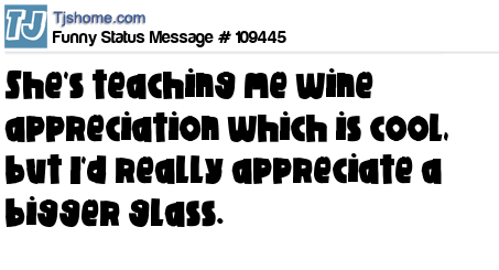 X says She's teaching me wine appreciation which is cool, but I'd really appreciate a bigger glass.