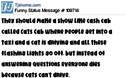 X says They should make a show like cash cab called Cats Cab where people get into a taxi and a cat is driving and all these flashing lights go off, but instead of answering questions everyone dies because cats can't drive.
