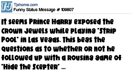 X is It seems Prince Harry exposed the Crown Jewels while playing "Strip Pool" in Las Vegas. This begs the questions as to whether or not he followed up with a rousing game of "Hide the Scepter" ...