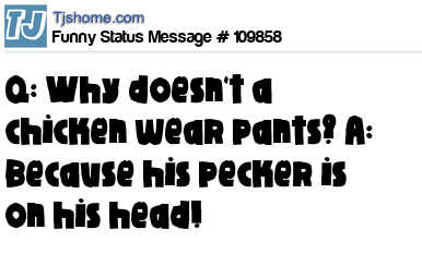 X Q: Why doesn't a chicken wear pants? A: Because his pecker is on his head!