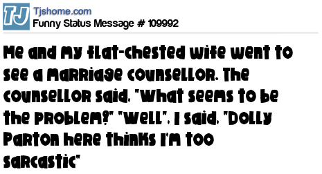 X is Me and my flat-chested wife went to see a marriage counsellor. The counsellor said, "What seems to be the problem?" "Well", I said, "Dolly Parton here thinks I'm too sarcastic"