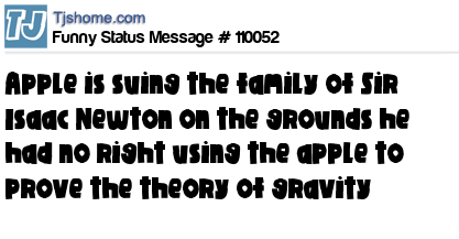 - # 109914 Apple is suing the family of Sir Isaac Newton. On the grounds he had no right using the apple to prove the theory of gravity.
