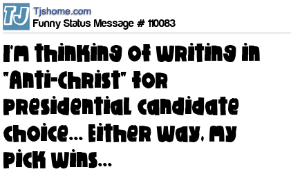 X I'm thinking of writing in "Anti-Christ" for presidential candidate choice... Either way, my pick wins...
