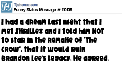 X says I had a dream last night that I met Skrillex and I told him NOT to star in the remake of "The Crow", that it would ruin Brandon Lee's legacy. He agreed.