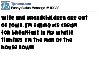X says Wife and grandchildren are out of town. I'm eating ice cream for breakfast in my whitie tighties, I'm the man of the house now!!