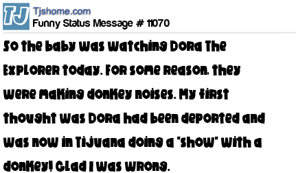 X is So the baby was watching Dora The Explorer today. For some reason, they were making donkey noises. My first thought was Dora had been deported and was now in Tijuana doing a "show" with a donkey! Glad I was wrong.
