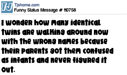 X I wonder how many identical twins are walking around now with the wrong names because their parents got them confused as infants and never figured it out.