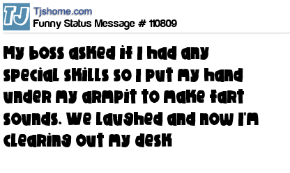 X says My boss asked if I had any special skills so I put my hand under my armpit to make fart sounds. We laughed and now I'm clearing out my desk