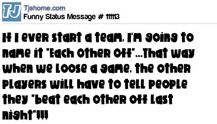 X is If I ever start a team, I'm going to name it "Each Other Off"...That way when we loose a game, the other players will have to tell people they "beat each other off last night"!!!