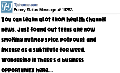 X you can learn alot from health Channel news. Just found out teens are now smoking nutmeg spice, potpouri, and incense as a subtitute for weed. Wondering if there's a business opportunity here....