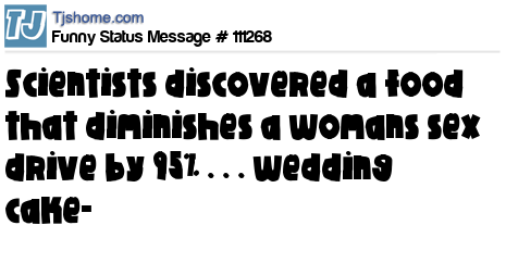 - # 9717 Scientists have discovered a food that diminishes a woman's sex drive by 90%. It's called Wedding Cake.