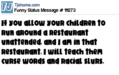 X is If you allow your children to run around a restaurant unattended, and I am in that restaurant, I will teach them curse words and racial slurs.