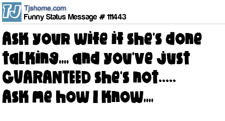 X Ask your wife if she's done talking,,,, and you've just GUARANTEED she's not..... Ask me how I know,,,,