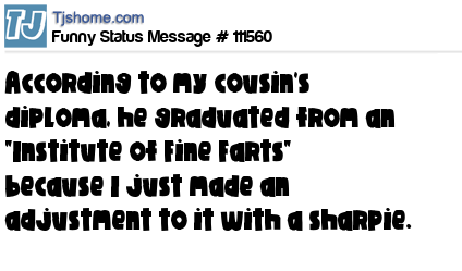 X says According to my cousin's diploma, he graduated from an "Institute of Fine Farts" because I just made an adjustment to it with a sharpie.