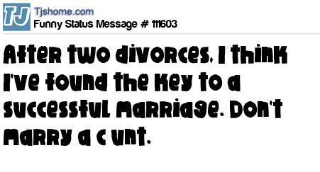 X says After two divorces, I think I've found the key to a successful marriage. Don't marry a c unt.