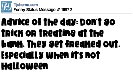 X Advice of the day: Don't go trick or treating at the bank. They get freaked out. Especially when it's not Halloween