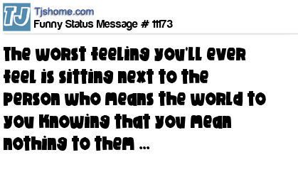 - # 11309 says The worst feeling you'll ever feel is sitting next to the person who means the world to you knowing that you mean nothing to them ... But it cheers you up when you let off a nice silent one and walk away........
