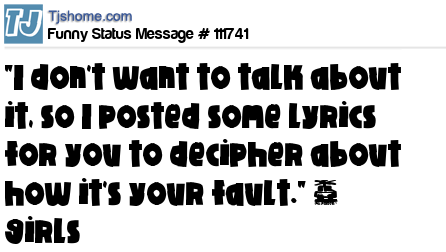 X "I don't want to talk about it, so I posted some lyrics for you to decipher about how it's your fault." ~ girls
