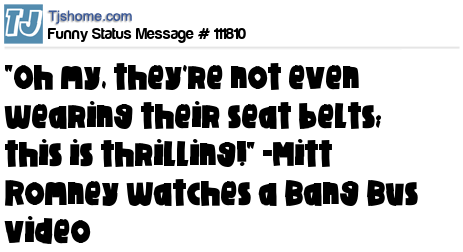 X "Oh my, they're not even wearing their seat belts; this is thrilling!" -Mitt Romney watches a Bang Bus video