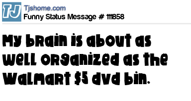 X says My brain is about as well organized as the Walmart $5 dvd bin.