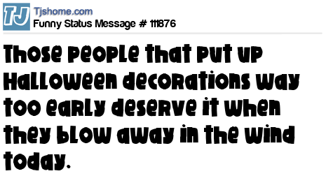 X says Those people that put up Halloween decorations way too early deserve it when they blow away in the wind today.