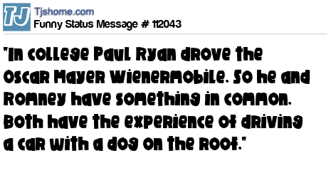 - # 112041 "You know what the only business experience Paul Ryan guy has? As a teenager he drove the Oscar Mayer Wienermoble. A Republican inside a wiener. Usually it's the other way around."