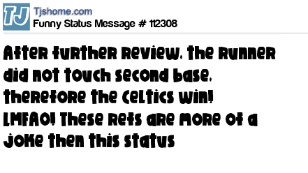 X After further review, the runner did not touch second base, therefore the Celtics win! LMFAO! These refs are more of a joke then this status