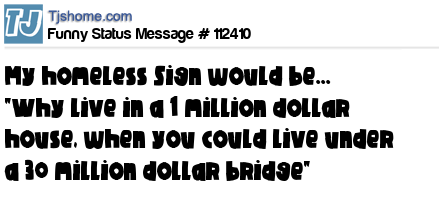 - # 182961 Today I saw a homeless man holding a sign that said "why live in a 100k home when I can live under a 3 million dollar bridge?" Now thats what I call being BOLD