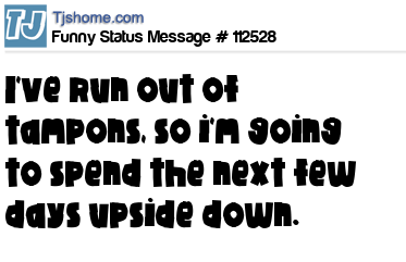 X says I've run out of tampons, so i'm going to spend the next few days upside down.