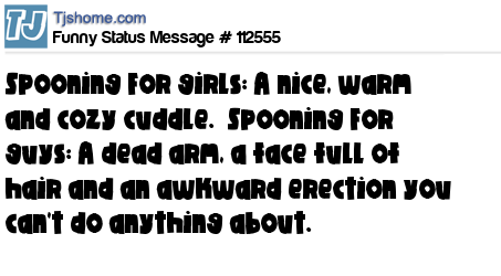 X says Spooning For girls: A nice, warm and cozy cuddle. Spooning For guys: A dead arm, a face full of hair and an awkward erection you can't do anything about.
