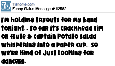 X I'm holding tryouts for my band tonight... So far it's Crackhead Tim on flute & Captain Potato salad whispering into a paper cup,,, so we're kind of just looking for dancers.