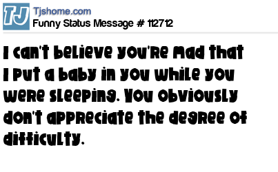 X says I can't believe you're mad that I put a baby in you while you were sleeping. You obviously don't appreciate the degree of difficulty.