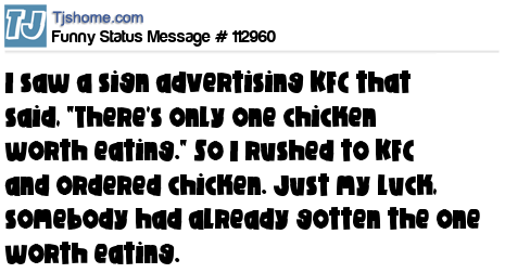 X says I saw a sign advertising KFC that said, "There's only one chicken worth eating." So I rushed to KFC and ordered chicken. Just my luck, somebody had already gotten the one worth eating.