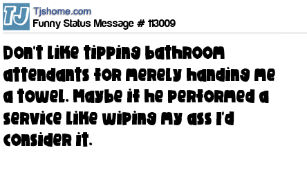 X says Don't like tipping bathroom attendants for merely handing me a towel. Maybe if he performed a service like wiping my ass I'd consider it.
