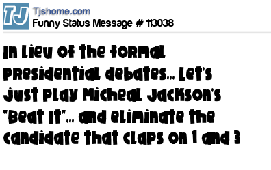X In lieu of the formal presidential debates,,, Let's just play Micheal Jackson's "Beat It",,, and eliminate the candidate that claps on 1 and 3
