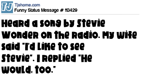 X  Heard a song by Stevie Wonder on the radio. My wife said "I'd like to see Stevie". I replied "He would, too."