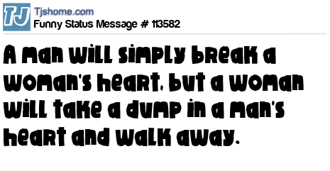 - # 50169 I truly believe that the key difference between men and women, is that a man can break a woman's heart, but a woman will sh!t IN a man's heart...