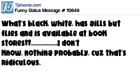 X What's black, white, has gills but flies and is available at book stores??.................I don't know, nothing probably, cuz that's ridiculous.