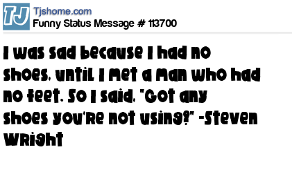 - # 157641 I once complained that I had no shoes, until I met a man with no feet. So I took his shoes. I mean seriously, it's not like he needed them or anything.