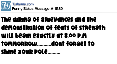 X says the airing of grievances and the demonstration of feats of strength will begin exactly at 8.00 p.m tommorrow...........dont forget to shine your pole..........