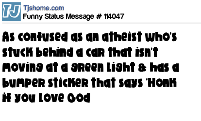 X says As confused as an atheist who's stuck behind a car that isn't moving at a green light & has a bumper sticker that says 'Honk if you love God