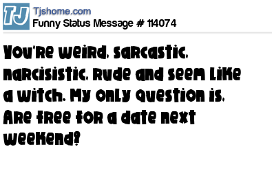 X says You're weird, sarcastic, narcisistic, rude and seem like a witch. My only question is, Are free for a date next weekend?