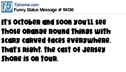 X is It's October and soon you'll see those orange round things with scary carved faces everywhere. That's right, the cast of Jersey Shore is on tour.