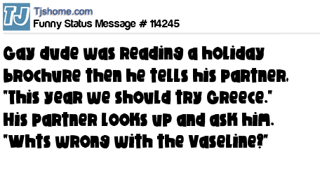 X is Gay dude was reading a holiday brochure then he tells his partner, "This year we should try Greece." His partner looks up and ask him. "Whts wrong with the Vaseline?"