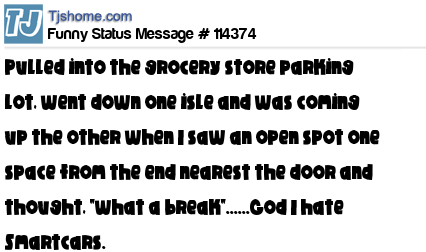 X Pulled into the grocery store parking lot, went down one isle and was coming up the other when I saw an open spot one space from the end nearest the door and thought, "what a break"......God I hate Smartcars.