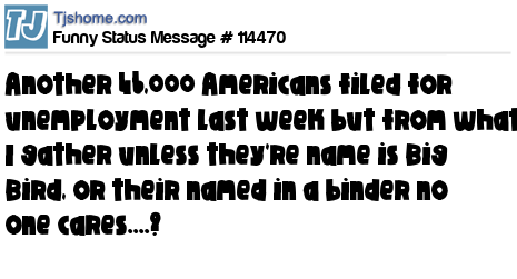 X says Another 46,000 Americans filed for unemployment last week but from what I gather unless they're name is Big Bird, or their named in a binder no one cares....?