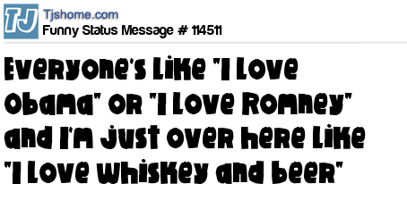 X  Everyone's like "I love Obama" or "I love Romney" and I'm just over here like "I love whiskey and beer"