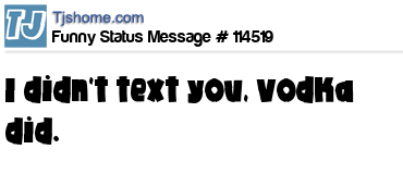 - # 131905 Me: I'm so over her. Vodka: No you're not, you should text her. Me: Really? Vodka: Hell yes! 25 times.