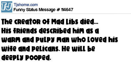 X  The creator of Mad Libs died... His friends described him as a warm and pulpy man who loved his wife and pelicans. He will be deeply pooped.