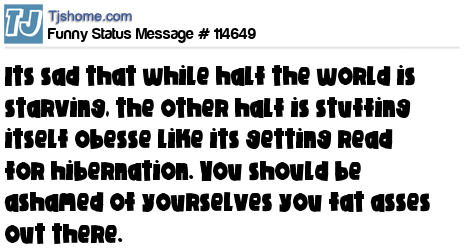 X says Its sad that while half the world is starving, the other half is stuffing itself obesse like its getting read for hibernation. You should be ashamed of yourselves you fat asses out there.